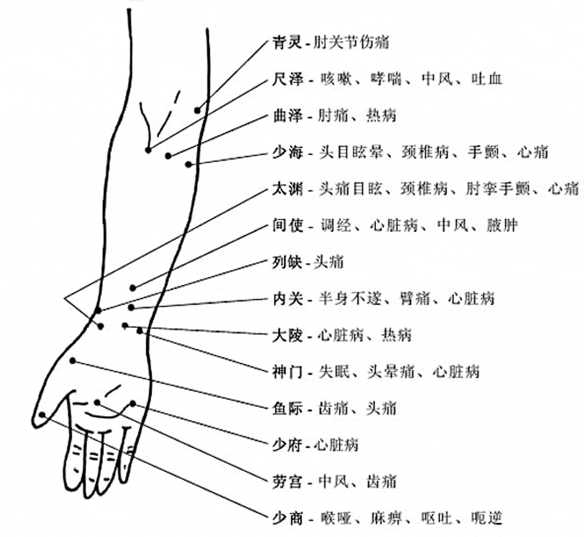 少海 手少阴心经 屈肘举臂,当肘横纹内侧端与肱骨内上髁连线的中点处。 心痛等心病,神志病,肩臂挛痛,头项痛,胸胁胀痛,瘰疬 合穴 暂无